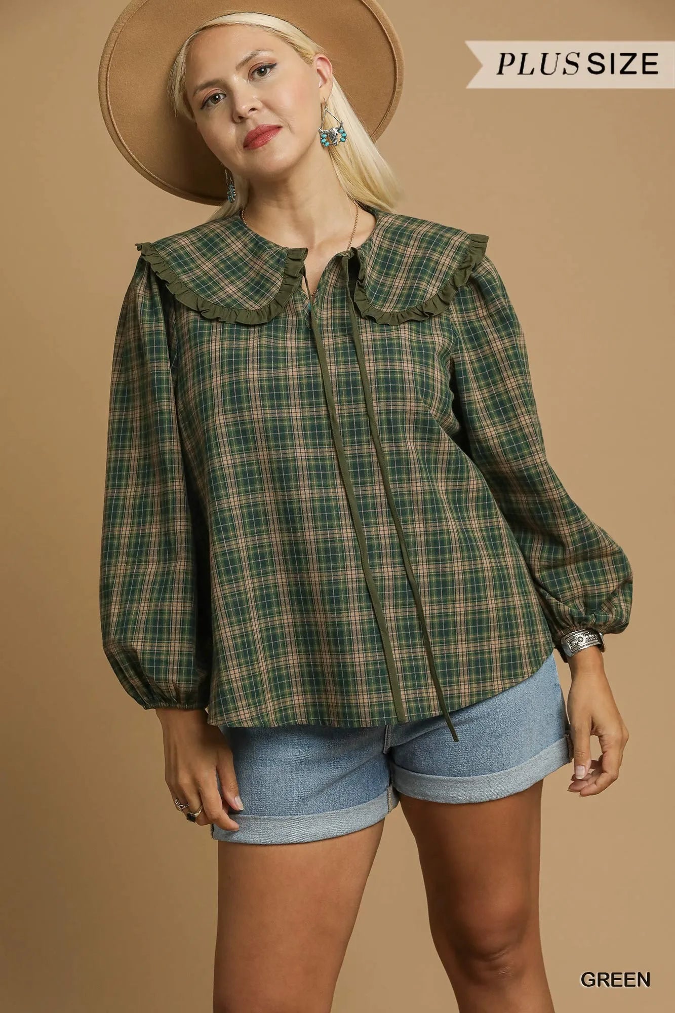 This charming green plaid blouse features a romantic ruffle collar and feminine puff sleeves that create a vintage-inspired silhouette. Made from soft cotton blend fabric, it offers comfortable all-day wear with its relaxed fit design. The classic button-up front and elastic sleeve cuffs provide both style and functionality. Perfect for casual outings, weekend brunches, or layering in cooler weather. The timeless plaid pattern adds a preppy touch while the ruffle details bring feminine charm. Machine washable for easy care and maintenance.